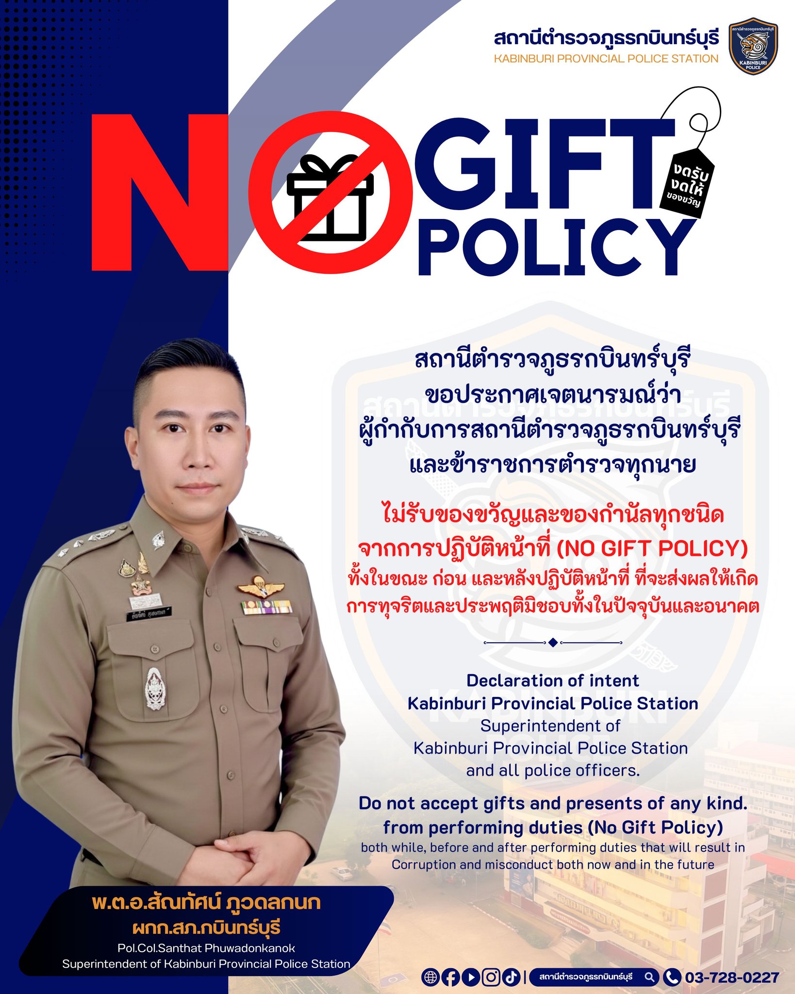 พ.ต.อ.สัณทัศน์ ภูวดลกนก ผกก.สภ.กบินทร์บุรี ประกาศเจตนารมณ์ที่จะไม่รับของขวัญและของกำนัลทุกชนิดจากการ