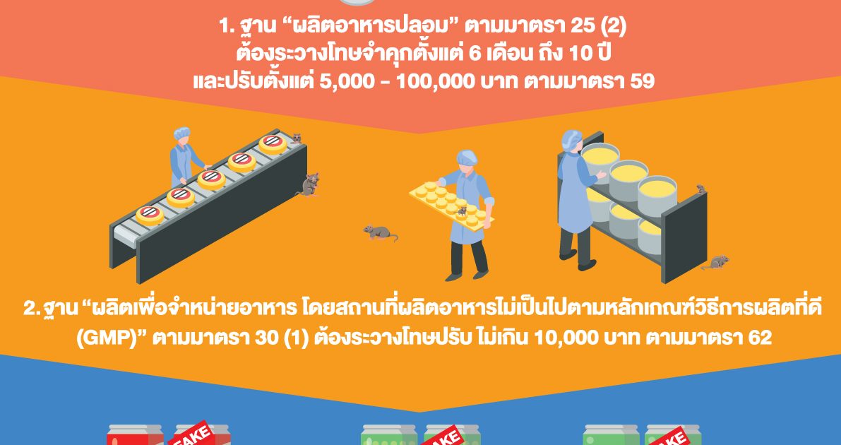 1.ฐาน “ผลิตอาหารปลอม” ตามมาตรา 25 (2) ต้องระวางโทษจำคุกตั้งแต่ 6 เดือน ถึง 10 ปี และปรับตั้งแต่ 5,000 – 100,000 บาท ตามมาตรา 59