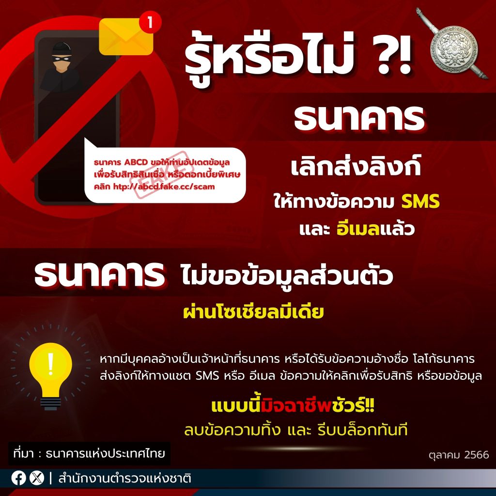 หากท่านได้รับการติดต่อจากบุคคล อ้างเป็นเจ้าหน้าที่ธนาคาร หรือได้รับข้อความ อีเมล์ อ้างชื่อธนาคาร โลโก้ธนาคาร ส่งข้อความ “พร้อมแนบลิงก์” ให้กดเข้าไปพูดคุย กรอกข้อมูล อ้างว่าเพื่อรับสิทธิต่าง ๆ หรืออัปเดตข้อมูล เช่น ขอสำเนาบัตรประชาชน ขอให้ถ่ายภาพสแกนในหน้า ฯลฯ
