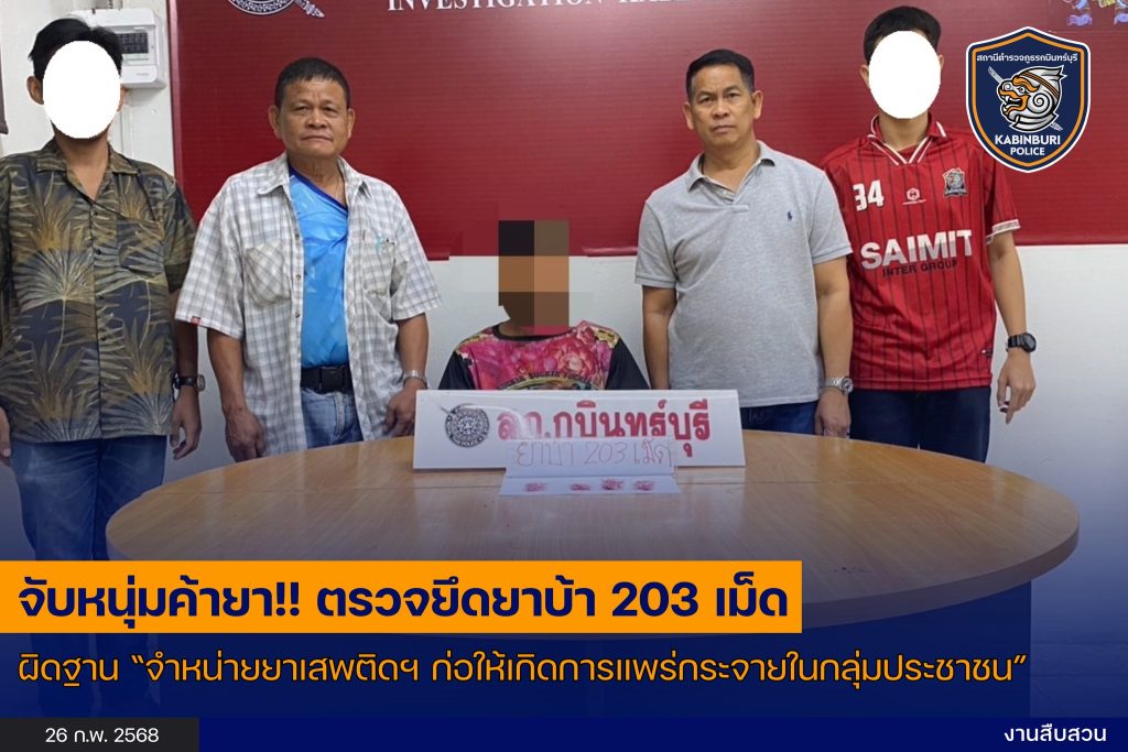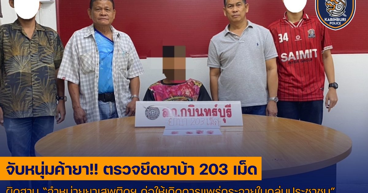 จับกุมตัวผู้ต้องหา นายวัชรพงศ์ หรือบอล อายุ 21 ปี ที่อยู่ ม.6 ต.เขาไม้แก้ว อ.กบินทร์บุรี จ.ปราจีนบุรี พร้อมของกลาง ยาบ้า จำนวน 203 เม็ด กระทำความผิดฐาน “จำหน่ายยาเสพติดให้โทษประเภทที่ 1 โดยการมีไว้เพื่อจำหน่าย โดยกระทำเพื่อการค้า และก่อให้เกิดการแพร่กระจายในกลุ่มประชาชน”