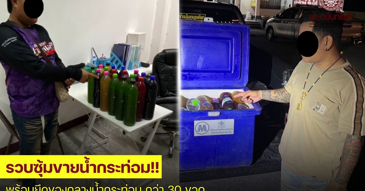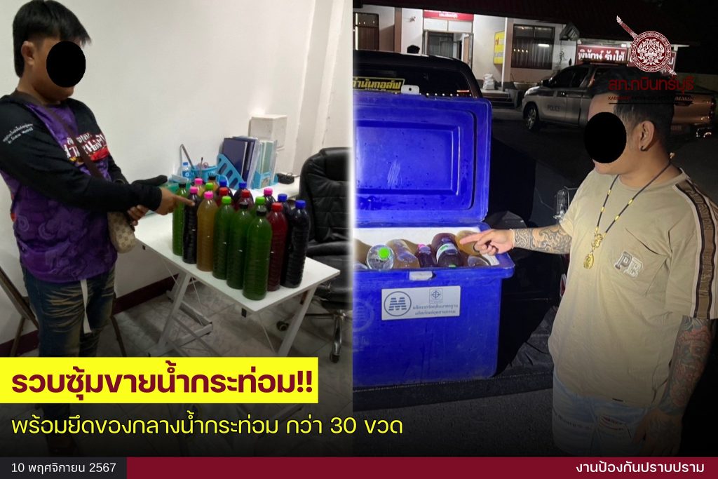 1. นายกิตติศักดิ์ อายุ 31 ปี ที่อยู่ ม.21 ต.เมืองเก่า อ.กบินทร์บุรี จ.ปราจีนบุรี พร้อมของกลาง 1. น้ำกระท่อมขนาด 1.5 ลิตร จำนวน 14 ขวด 2. น้ำกระท่อมขนาด 0.75 ลิตร จำนวน 2 ขวด