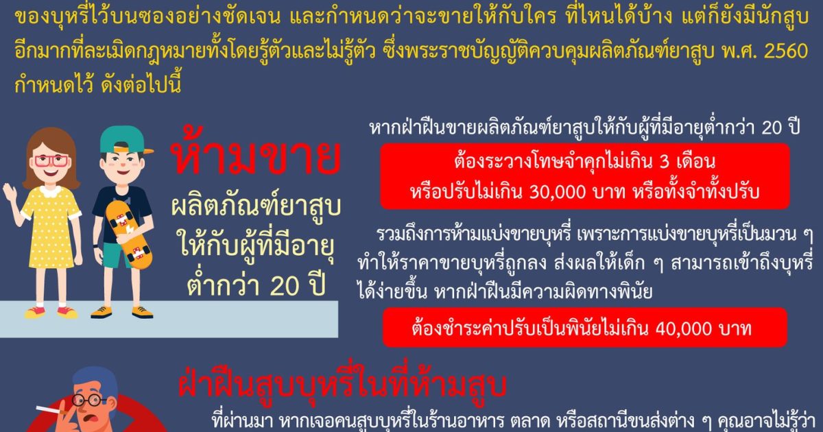 แม้ในเมืองไทยเราจะกำหนดพื้นที่สูบบุหรี่ไว้ชัดเจน ทั้งตามอาคารสถานที่ต่าง ๆ ไม่ว่าจะเป็นพื้นที่เอกชนหรือราชการ รวมถึงพิมพ์คำเตือนถึงโทษภัยของบุหรี่ไว้บนซองอย่างชัดเจน และกำหนดว่าจะขายให้กับใคร ที่ไหนได้บ้าง แต่ก็ยังมีนักสูบอีกมากที่ละเมิดกฎหมายทั้งโดยรู้ตัวและไม่รู้ตัว ซึ่งพระราชบัญญัติควบคุมผลิตภัณฑ์ยาสูบ พ.ศ. 2560 กำหนดไว้ ดังต่อไปนี้