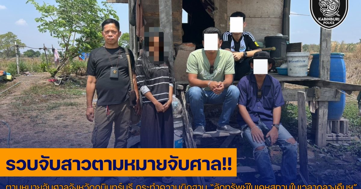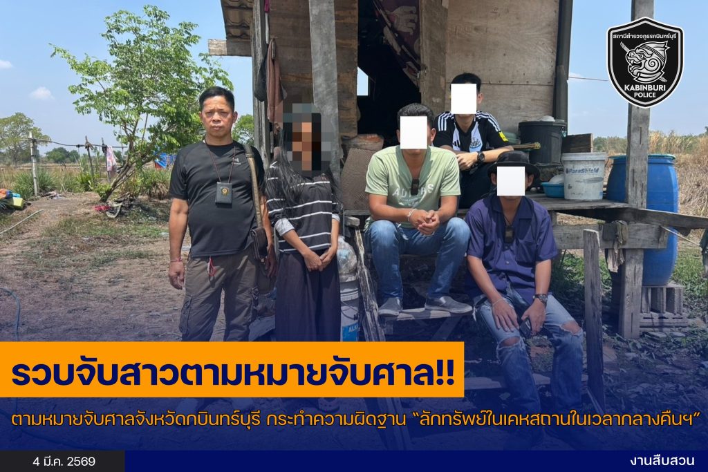 1.น.ส.เจนจิรา อายุ 37 ปี ที่อยู่ ม.6 ต.บ่อทอง อ.กบินทร์บุรี จ.ปราจีนบุรี กระทำความผิดตาม หมายจับศาลจังหวัดกบินทร์บุรี ที่ จ.7/2569 ลงวันที่ 4 มีนาคม 2569 ซึ่งต้องหาว่ากระทำความผิดฐาน “ลักทรัพย์ในเคหสถานในเวลากลางคืน โดยทำอันตรายสิ่งกีดกั้นสำหรับคุ้มครองบุคคลหรือทรัพย์สินหรือโดยผ่านสิ่งเช่นว่านั้นเข้าไปด้วยประการใดๆ, บุกรุกเข้าไปในอสังหาริมทรัพย์ของผู้อื่นด้วยประการใดๆ อันเป็นการรบกวนการครอบครองอสังหาริมทรัพย์ของผู้อื่นโดยปกติสุข”