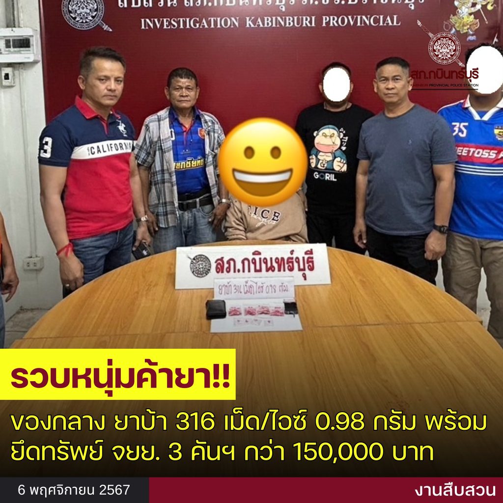 ร่วมจับกุมตัวผู้ต้องหา นายอนันต์ หรือโอ๊ต อายุ 30 ปี ที่อยู่ ม.16 ต.เมืองเก่า อ.กบินทร์บุรี จ.ปราจีนบุรี พร้อมของกลาง 1. ยาบ้า จำนวน 316 เม็ด และ 2. ไอซ์ น้ำหนักสุทธิ 0.98 กรัม กระทำความผิดฐาน “จำหน่ายยาเสพติดให้โทษประเภท 1 (ยาบ้า,ไอซ์) โดยการมีไว้ในครอบครองเพื่อจำหน่ายโดยไม่ได้รับอนุญาตอันเป็นการกระทำเพื่อการค้าและก่อให้เกิดการแพร่กระจายในกลุ่มประชาชน”