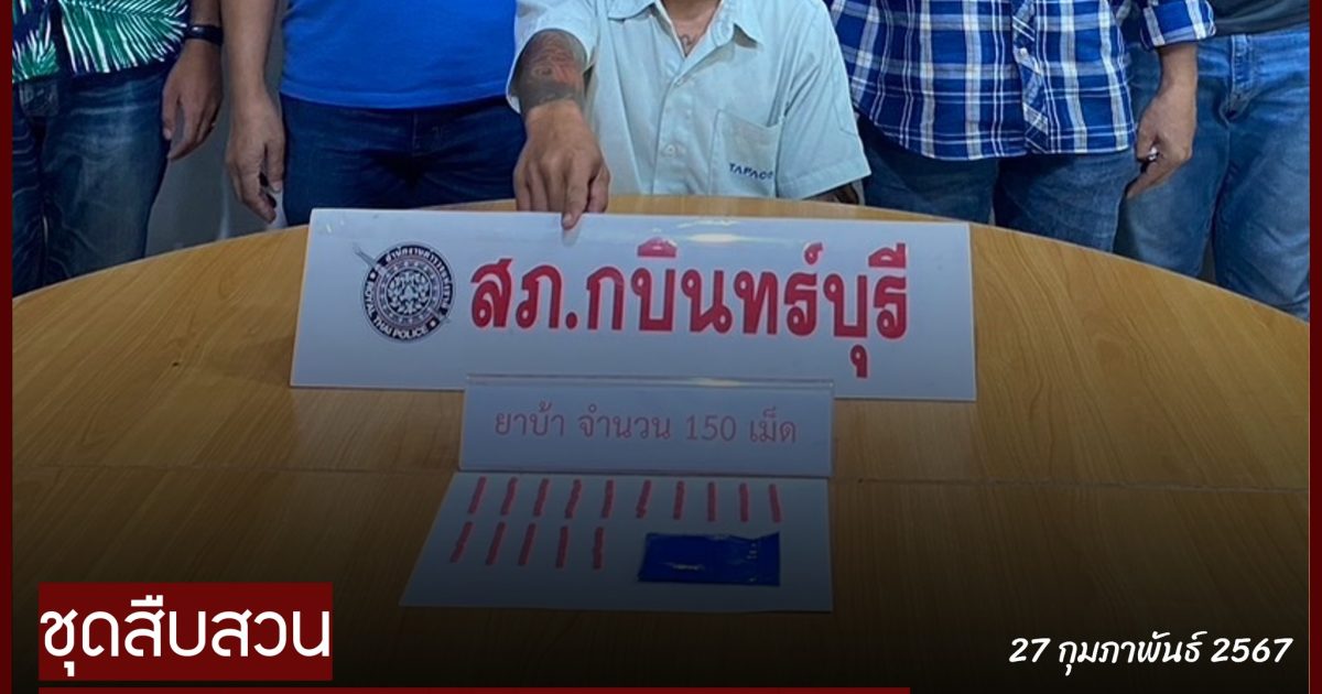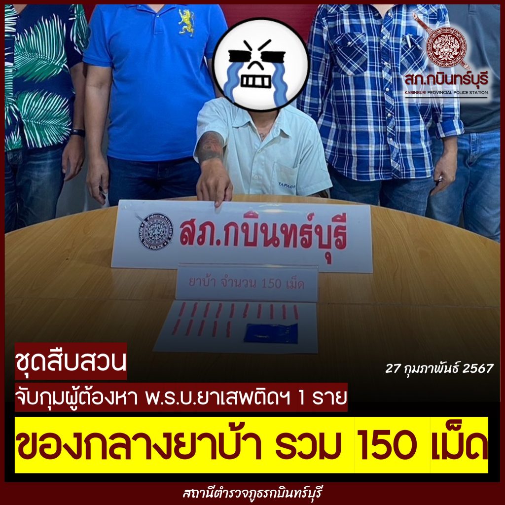 ชุดสืบสวนปราบปรามยาเสพติด 26 กุมภาพันธ์ 2567 โดย kabinburi / ข่าวประชาสัมพันธ์,ข่าวกิจกรรม,ข่าวประชาสัมพันธ์,งานสืบสวน วันที่ 26 ก.พ.67 ชุดสืบสวน ได้ร่วมกันทำการจับตัว นายอนุวัฒน์ อายุ 31 ปี พร้อมของกลาง ยาบ้า จำนวน 150 เม็ด กระทำความผิดฐาน “จำหน่ายยาเสพติดให้โทษประเภท 1 (ยาบ้า) โดยการมีไว้เพื่อจำหน่าย”นำตัวผู้ต้องหาส่งพนักงานสอบสวน สภ.กบินทร์บุรี ดำเนินคดีตามกฎหมายต่อไป