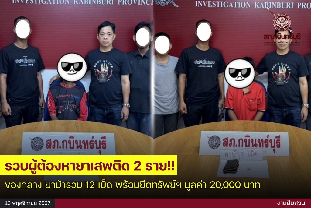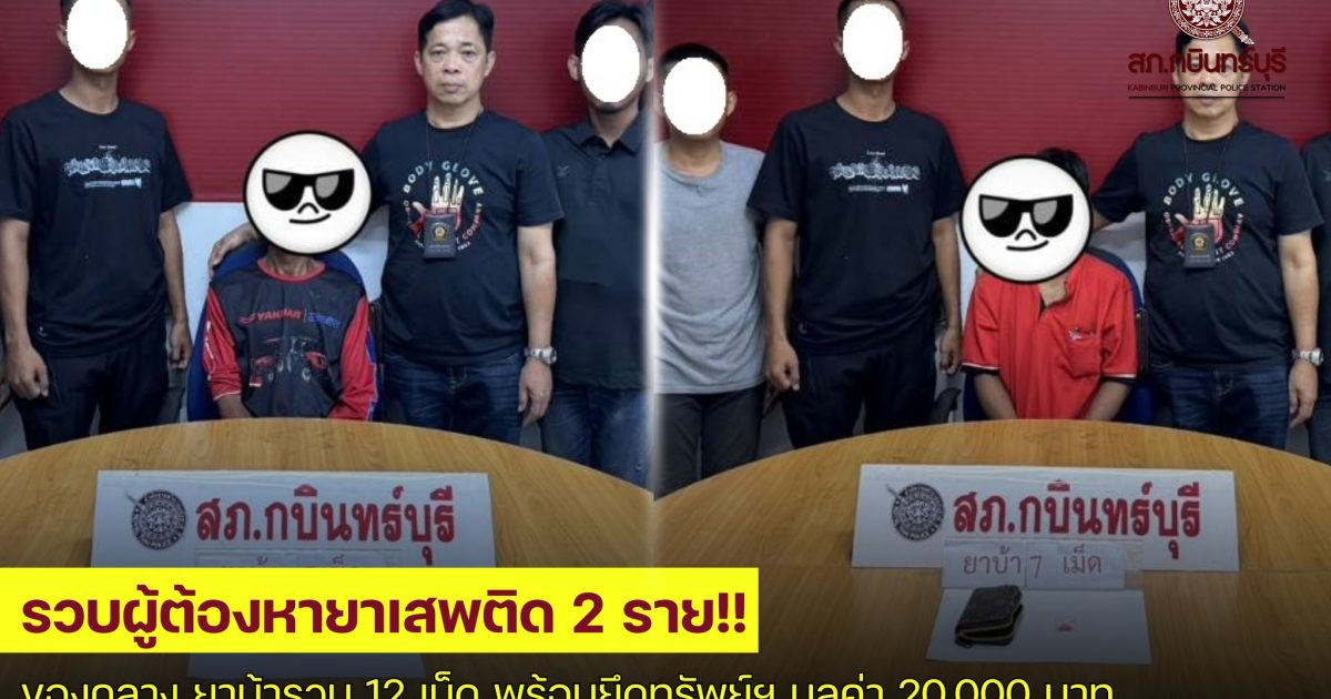 2. นายปัญญา อายุ 27 ปี ที่อยู่ ม.2 ต.เขาไม้แก้ว อ.กบินทร์บุรี จ.ปราจีนบุรี พร้อมของกลาง ยาบ้า จำนวน 7 เม็ด กระทำความผิดฐาน “มียาเสพติดให้โทษประเภทที่ 1 (เมทแอมเฟตามีน)ไว้ในครอบครอง โดยไม่ได้รับอนุญาต“ พร้อมตรวจยึดตาม พ.ร.บ.มาตรการยาเสพติดฯ โทรศัพท์มือถือ จำนวน 1 เครื่อง ราคา 10,000 บาท