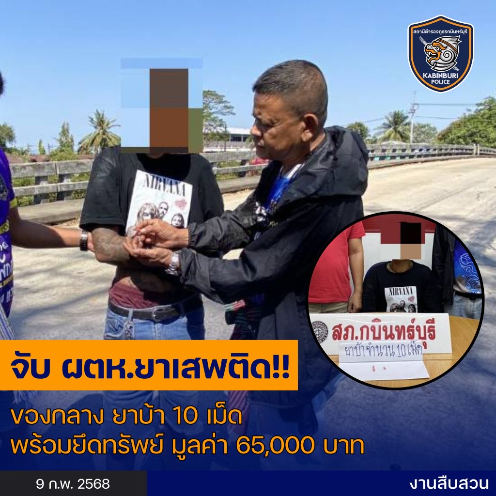 ชุดสืบสวน ระดมกวาดล้างป้องกันปราบปรามอาชญากรรม ยาเสพติด จับกุมนายเจตริน หรือเจต อายุ 24 ปี พร้อมของกลาง ยาบ้า 10 เม็ด ยึดทรัพย์ฯ มูลค่ารวม 65,000 บาท