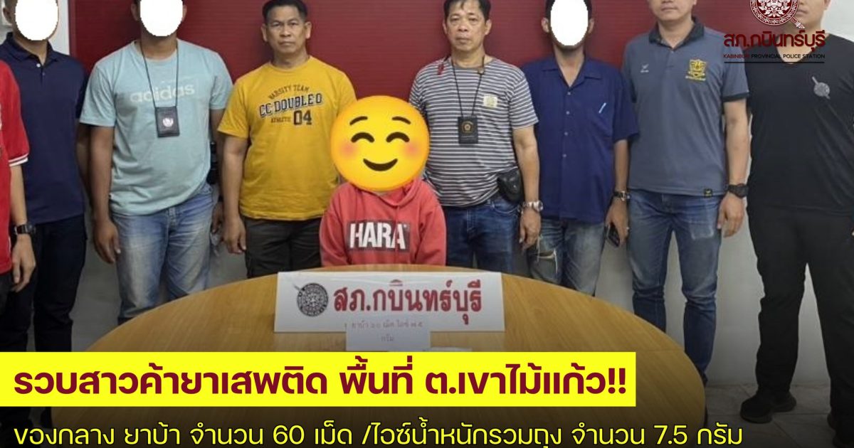 จับกุมตัวผู้ต้องหา น.ส.ยอดฟ้า อายุ 33 ปี ที่อยู่ ม.6 ต.เขาไม้แก้ว อ.กบินทร์บุรี จ.ปราจีนบุรี พร้อมของกลาง 1. ยาบ้า จำนวน 60 เม็ด 2. ไอซ์ น้ำหนักรวมถุง จำนวน 7.5 กรัม