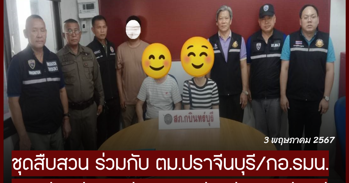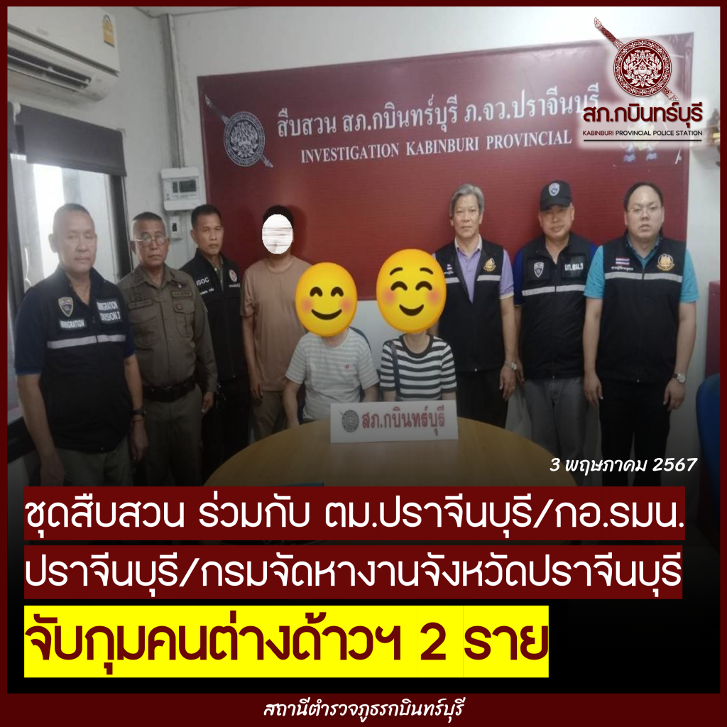 เมื่อวันที่ 3 พ.ค.67 ชุดสืบสวน สภ.กบินทร์บุรี ร่วมกับ ตม.ปราจีนบุรี , กอ.รมน.ปราจีนบุรี และกรมจัดหางานจังหวัดปราจีนบุรี ได้ร่วมจับกุมผู้ต้องหา 2 ราย