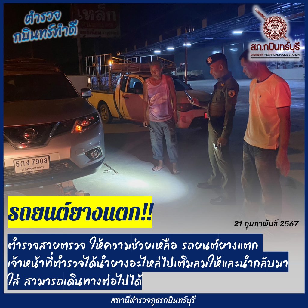 วันที่ 21 ก.พ.67 เวลา 21.20 น. ร.ต.อ.ธีรพงษ์ เดชอำพรภิญโญ รอง สวป.สภ.กบินทร์บุรี พร้อมกำลัง ด.ต.มนูญ ศรีไสย์ ,ส.ต.ต.เวชพิสิฐ แจ้งไข่ และ ส.ต.ต.วรเดช ไชยรบ ช่วยเหลือรถยนต์ยางแตก(เหยียบสิ่งของตกหล่นบนพื้นผิวถนน) บริเวณถนนสาย 304 ใกล้จุดกลับรถ ต.สุขภัณฑ์(ขาขึ้น) ได้นำยางอะไหล่ไปเติมลมให้ และนำกลับมาใส่ เดินทางกลับบ้านได้เรียบร้อยดี