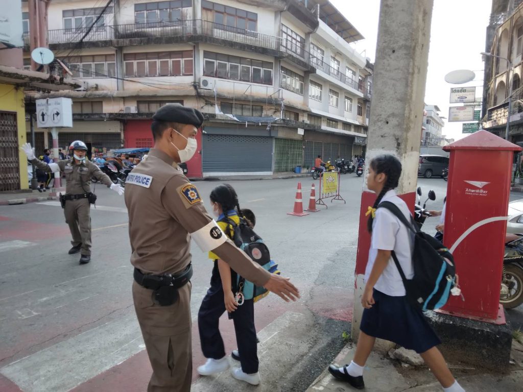 ตรวจสภาพการจราจร อำนวยความสะดวกด้านการจราจรบริเวณแยกสมานมิตร และหน้าโรงเรียนเจียหมิน