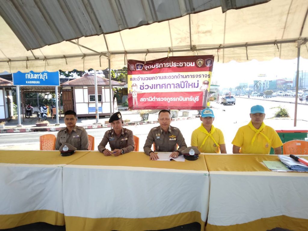 วันที่ 31 ธ.ค.67 เวลา 09.30 น. พ.ต.ต.สมชาย พฤษไพบูลย์กิจ สว.(สอบสวน)ฯ ปฏิบัติหน้าที่ สว.จร.สภ.กบินทร์บุรี, ร.ต.อ.สุชด ลาภไธสง รอง สว.จร.สภ.กบินทร์บุรี พร้อมชุดเคลื่อนที่เร็ว ตรวจเยี่ยมจุดบริการประชาชนบริเวณสี่แยกไฟแดงสามทหาร ตรวจสภาพการจราจรและอำนวยความสะดวกการจราจร ถนน 33,304 บริเวณสี่แยกไฟแดงสามทหารพบเจ้าหน้าที่ตำรวจจราจรอยู่ปฏิบัติหน้าที่