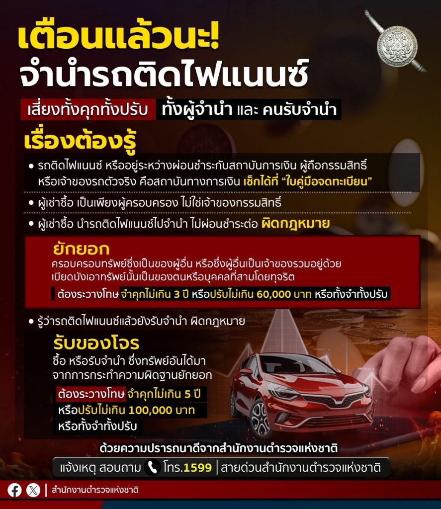 สำนักงานตำรวจแห่งชาติ จึงขอเตือนพี่น้องประชาชนว่า รถที่ติดไฟแนนซ์หรืออยู่ระหว่างผ่อนชำระกับสถาบันทางการเงิน ผู้ถือกรรมสิทธิ์หรือเจ้าของรถตัวจริงของรถคันดังกล่าว คือสถาบันทางการเงิน ส่วนผู้เช่าซื้อเป็นเพียงผู้ครอบครองเท่านั้น ไม่ได้เป็นเจ้าของกรรมสิทธิ์โดยสมบูรณ์