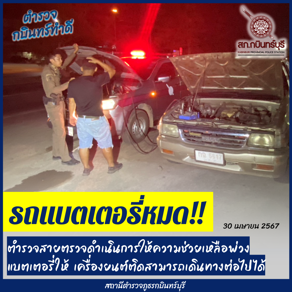 ตำรวจกบินทร์ทำดี 30 เมษายน 2567 โดย kabinburi / ข่าวประชาสัมพันธ์,ข่าวกิจกรรม,ข่าวประชาสัมพันธ์,งานป้องกันปราบปราม,ตำรวจกบินทร์ทำดี วันที่ 30 เม.ย.67 เวลา 02.30 น. ร.ต.อ.พิพัฒน์ ศิลา รอง สวป.สภ.กบินทร์บุรี พร้อมกำลัง ส.ต.ต.โชคชัย บัวเรียน ผบ.หมู่(ผช.พงส.)สภ.กบินทร์บุรี สายตรวจรถยนต์ประชาชนได้ไปติดต่อด้วยตนเองที่ศูนย์วิทยุ สภ.กบินทร์บุรี เพื่อขอความช่วยเหลือ พ่วงแบตเตอรี่รถยนต์แบตหมด สายตรวจจึงมาให้ความช่วยเหลือ พ่วงแบตเตอรี่ รถประชาชน สามารถเดินทางต่อไปได้