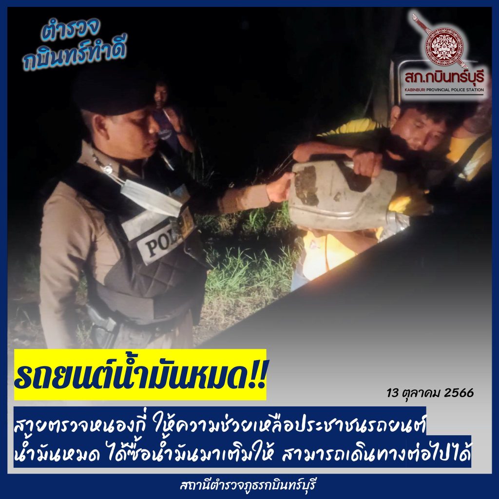ตำรวจกบินทร์ ช่วยเหลือประชาชน รถยนต์น้ำมันหมด 13 ตุลาคม 2566 โดย kabinburi / ข่าวประชาสัมพันธ์,ข่าวกิจกรรม วันที่ 13 ต.ค.66 เวลา 02.30 น. ร.ต.ท.อาคม แนวสุข รอง สว.(ป.)สภ.กบินทร์บุรี และ ด.ต.ปราโมทย์ ชมภูนุช ผบ.หมู่(ป.)สภ.กบินทร์บุรี ปฏิบัติหน้าที่สายตรวจเทศบาลเมืองหนองกี่ ออกปฏิบัติหน้าที่เหตุ 191 ให้ความช่วยเหลือประชาชน เหตุประชาชนขอความช่วยเหลือรถยนต์น้ำมันหมด บริเวณตรงข้ามปั๊มก๊าซ NGV เจ้าหน้าที่ได้ซื้อน้ำมันมาเติมให้ สามารถเดินทางต่อไปได้ #สถานีตำรวจภูธรกบินทร์บุรี #ช่วยเหลือประชาชน #ตำรวจทำดี #ตำรวจกบินทร์ยินดีรับใช้ประชาชน #งานป้องกันปราบปรามกบินทร์บุรี