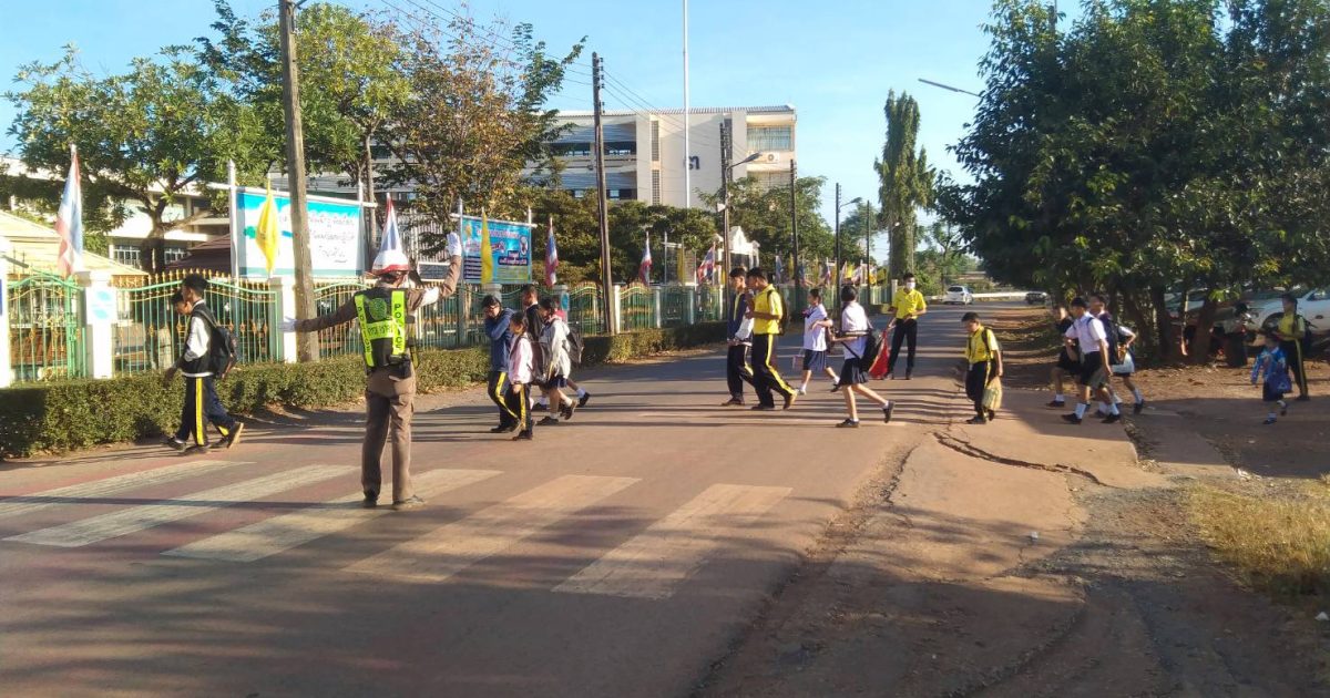 ตำรวจจราจร อำนวยความสะดวกด้านการจราจรแก่เด็กนักเรียน บริเวณหน้าโรงเรียนกบินทร์จริยาคม