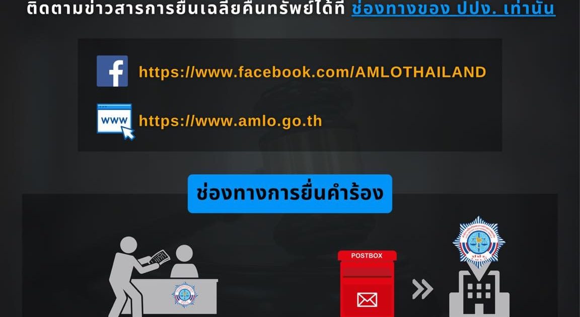 จากการกระทำความผิดมูลฐานในคดีต่างๆ โดยท่านสามารถติดตามข้อมูลได้ 2 ช่องทาง คือ https://www.facebook.com/AMLOTHAILAND และ https://www.amlo.go.th เท่านั้น