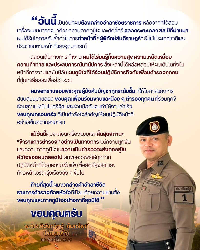 แม้วันนี้ผมจะถอดเครื่องแบบและสิ้นสุดสถานะ “ข้าราชการตำรวจ” อย่างเป็นทางการ แต่ความผูกพันและความภาคภูมิใจในความเป็นตำรวจจะยังคงอยู่ในหัวใจของผมตลอดไป ผมขออวยพรให้ทุกท่านปฏิบัติหน้าที่ด้วยความเข้มแข็ง ซื่อสัตย์สุจริต และก้าวหน้าเจริญรุ่งเรืองยิ่ง ๆ ขึ้นไป