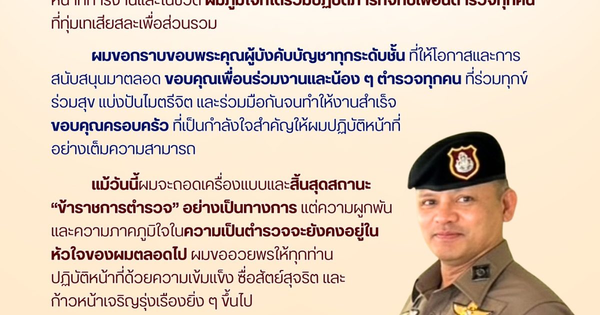 แม้วันนี้ผมจะถอดเครื่องแบบและสิ้นสุดสถานะ “ข้าราชการตำรวจ” อย่างเป็นทางการ แต่ความผูกพันและความภาคภูมิใจในความเป็นตำรวจจะยังคงอยู่ในหัวใจของผมตลอดไป ผมขออวยพรให้ทุกท่านปฏิบัติหน้าที่ด้วยความเข้มแข็ง ซื่อสัตย์สุจริต และก้าวหน้าเจริญรุ่งเรืองยิ่ง ๆ ขึ้นไป