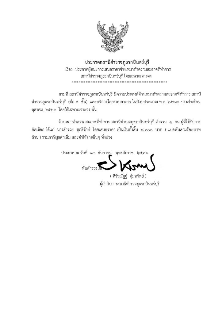 ประกาศผู้ชนะการเสนอราคาจ้างเหมาทำความสะอาดที่ทำการ สถานีตำรวจภูธรกบินทร์บุรี โดยเฉพาะเจาะจง