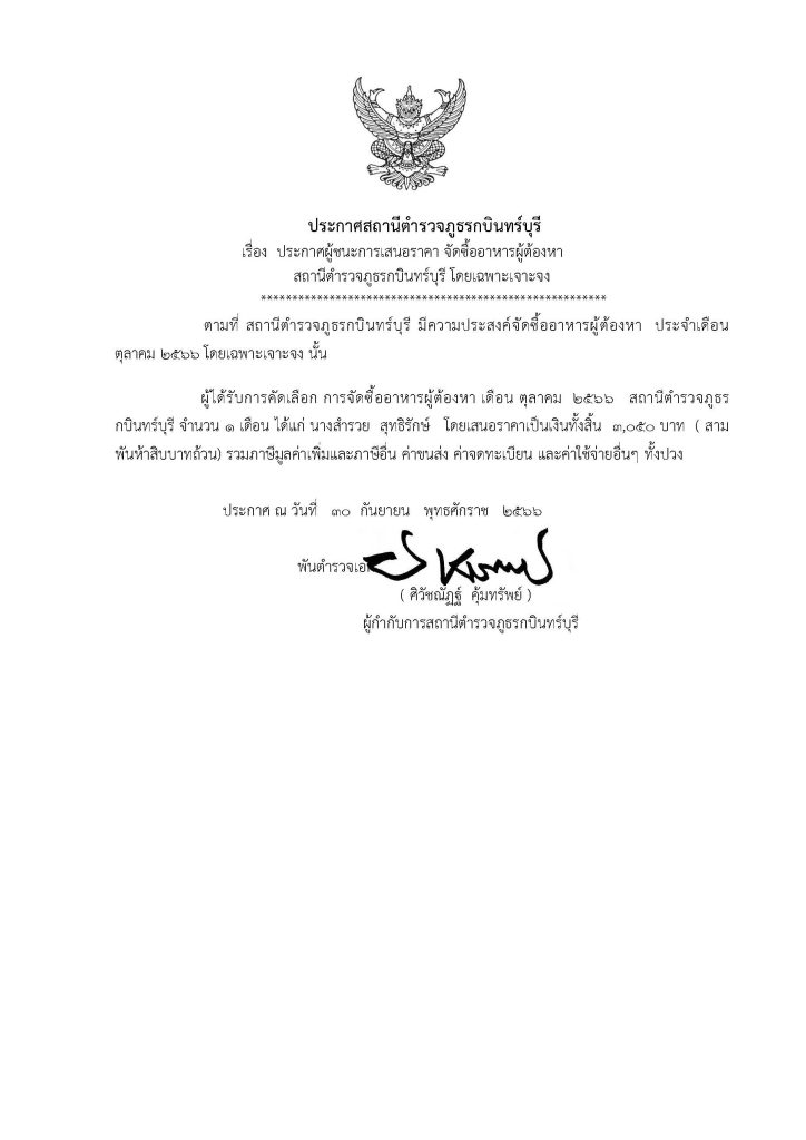 ประกาศผู้ชนะการเสนอราคา จัดซื้ออาหารผู้ต้องหา สถานีตำรวจภูธรกบินทร์บุรี โดยเฉพาะเจาะจง