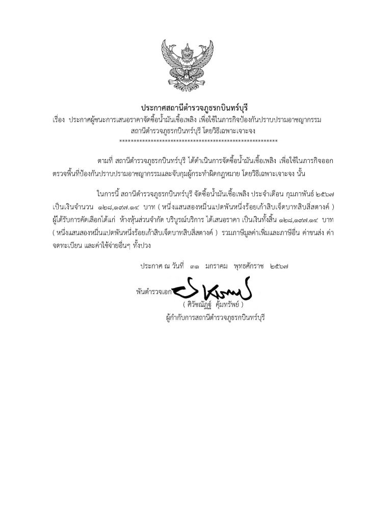 ตามที่ สถานีตำรวจภูธรกบินทร์บุรี ได้ดำเนินการจัดซื้อน้ำมันเชื้อเพลิง เพื่อใช้ในภารกิจออกตรวจพื้นที่ป้องกันปราบปรามอาชญากรรมและจับกุมผู้กระทำผิดกฎหมาย โดยวิธีเฉพาะเจาะจง นั้น ในการนี้ สถานีตำรวจภูธรกบินทร์บุรี จัดซื้อน้ำมันเชื้อเพลิง ประจำเดือน กุมภาพันธ์ 2567 เป็นเงินจำนวน 128,197.14 บาท ( หนึ่งแสนสองหมื่นแปดพันหนึ่งร้อยเก้าสิบเจ็ดบาทสิบสี่สตางค์ ) ผู้ได้รับการคัดเลือกได้แก่ ห้างหุ้นส่วนจำกัด บริบูรณ์บริการ ได้เสนอราคา เป็นเงินทั้งสิ้น 128,197.14 บาท ( หนึ่งแสนสองหมื่นแปดพันหนึ่งร้อยเก้าสิบเจ็ดบาทสิบสี่สตางค์ ) รวมภาษีมูลค่าเพิ่มและภาษีอื่น ค่าขนส่ง ค่าจดทะเบียน และค่าใช้จ่ายอื่นๆ ทั้งปวงประกาศ ณ วันที่ 31 มกราคม พุทธศักราช 2567