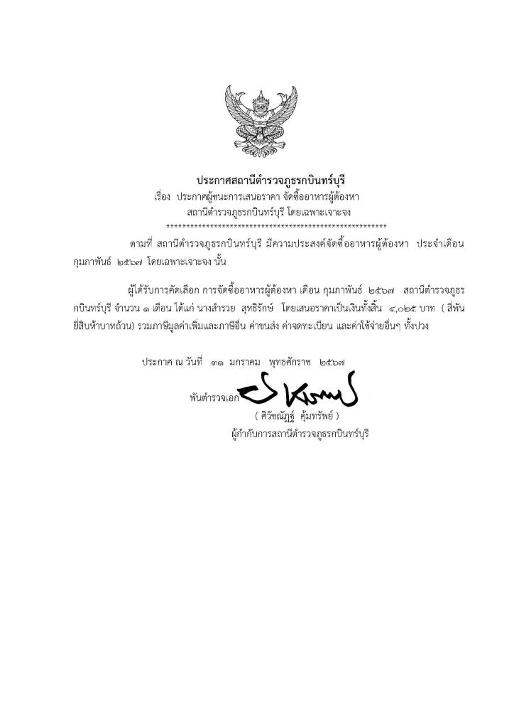 ประกาศผู้ชนะการเสนอราคา จัดซื้ออาหารผู้ต้องหา สถานีตำรวจภูธรกบินทร์บุรี โดยเฉพาะเจาะจง