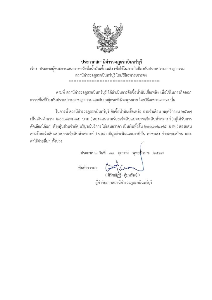 ในการนี้ สถานีตำรวจภูธรกบินทร์บุรี จัดซื้อน้ำมันเชื้อเพลิง ประจำเดือน พฤศจิกายน 2567 เป็นเงินจำนวน 200,378.75 บาท ( สองแสนสามร้อยเจ็ดสิบแปดบาทเจ็ดสิบห้าสตางค์ ) ผู้ได้รับการคัดเลือกได้แก่ ห้างหุ้นส่วนจำกัด บริบูรณ์บริการ ได้เสนอราคา เป็นเงินทั้งสิ้น 200,378.75 บาท ( สองแสนสามร้อยเจ็ดสิบแปดบาทเจ็ดสิบห้าสตางค์ ) รวมภาษีมูลค่าเพิ่มและภาษีอื่น ค่าขนส่ง ค่าจดทะเบียน และค่าใช้จ่ายอื่นๆ ทั้งปวง