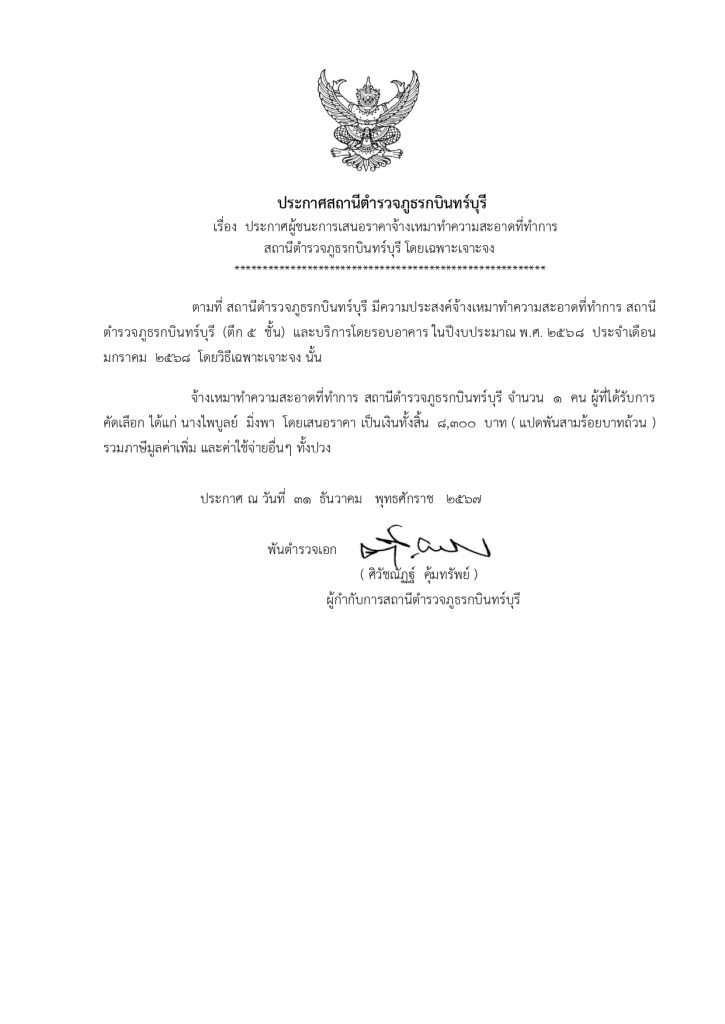 ประกาศผู้ชนะการเสนอราคาจ้างเหมาทำความสะอาดที่ทำการ สถานีตำรวจภูธรกบินทร์บุรี โดยเฉพาะเจาะจง
