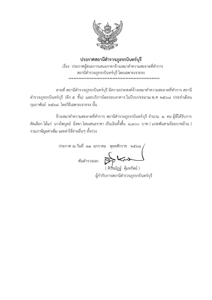 ประกาศผู้ชนะการเสนอราคาจ้างเหมาทำความสะอาดที่ทำการ สถานีตำรวจภูธรกบินทร์บุรี โดยเฉพาะเจาะจง