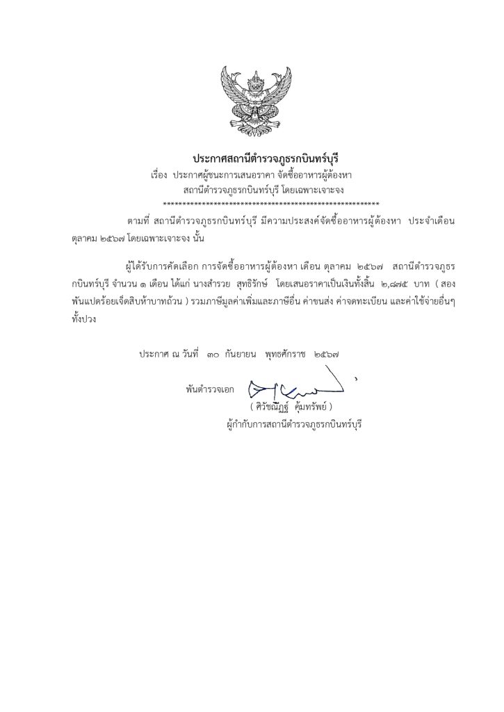 ประกาศผู้ชนะการเสนอราคา จัดซื้ออาหารผู้ต้องหา สถานีตำรวจภูธรกบินทร์บุรี โดยเฉพาะเจาะจง