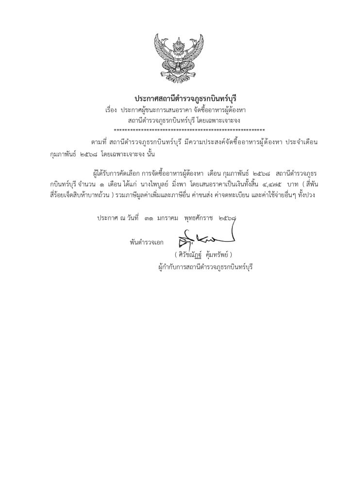 ผู้ได้รับการคัดเลือก การจัดซื้ออาหารผู้ต้องหา เดือน กุมภาพันธ์ 2568 สถานีตำรวจภูธรกบินทร์บุรี จำนวน 1 เดือน ได้แก่ นางไพบูลย์ มิ่งพา โดยเสนอราคาเป็นเงินทั้งสิ้น 4,475 บาท ( สี่พันสี่ร้อยเจ็ดสิบห้าบาทถ้วน ) รวมภาษีมูลค่าเพิ่มและภาษีอื่น ค่าขนส่ง ค่าจดทะเบียน และค่าใช้จ่ายอื่นๆ ทั้งปวง