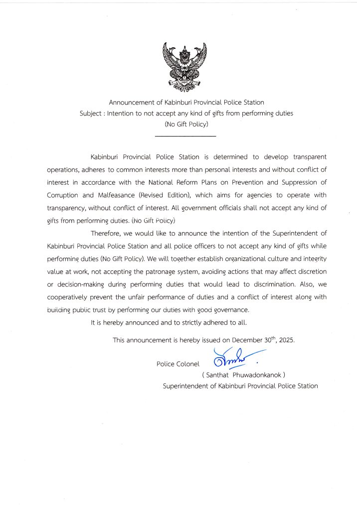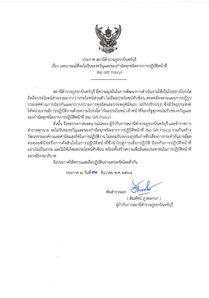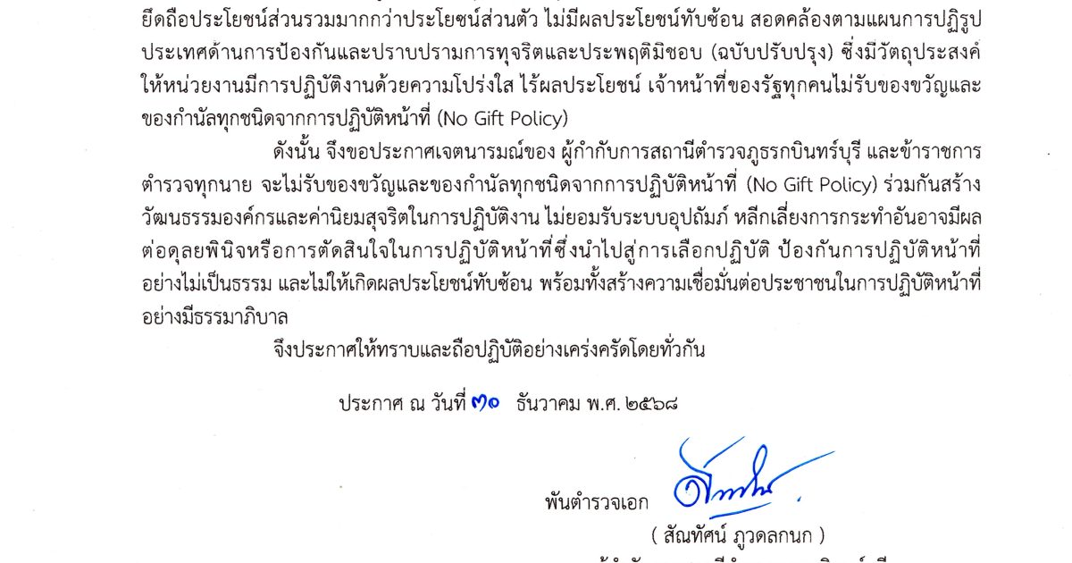 พ.ต.อ.สัณทัศน์ ภูวดลกนก ผกก.สภ.กบินทร์บุรี ประกาศเจตนารมณ์ที่จะไม่รับของขวัญและของกำนัลทุกชนิดจากการปฏิบัติหน้าที่ (No Gift Policy) ประกาศ ณ วันที่ 30 ธันวาคม พ.ศ.2568