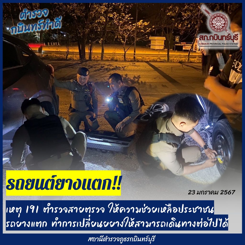 วันที่ 23 ม.ค.67 เวลา 21.00 น. ร.ต.อ.ถวัลย์ สุรขันธ์ รอง สว.(ป.)สภ.กบินทร์บุรี ร้อยเวรป้องกันปราบปราม พร้อมด้วย จ.ส.ต.ธีรศักดิ์ แววนำ ผบ.หมู่(ป.)สภ.กบินทร์บุรี สายตรวจรถยนต์ และ ส.ต.อ.ชนาวุธ สาระพันธ์ ผบ.หมู่(ป.)สภ.กบินทร์บุรี ,ส.ต.ต.ชวณัฐ พิริยโนทร ผบ.หมู่(ป.)สภ.กบินทร์บุรี สายตรวจรถจักรยานยนต์ ออกปฏิบัติหน้าที่เหตุ 191 ประชาชนขอความช่วยเหลือรถยนต์ยางแตก บริเวณถนน 304 ตรงข้ามโรงเรียนสายมิตรศึกษา ได้ช่วยทำการเปลี่ยนยยางให้ สามารถเดินทางต่อไปได้