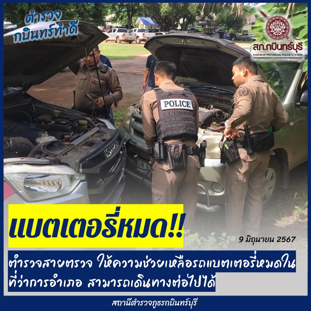 เหตุ 191 กรณี ประชาชนขอความช่วยเหลือรถแบตเตอรี่หมด อยู่บริเวณในที่ว่าการอำเภอกบินทร์บุรี ม.4 ต.กบินทร์ฯ จ้าหน้าที่ตำรวจได้ช่วยเหลือด้วยการพ่วงแบตเตอรี่ให้ รถยนต์สตาร์ทติดสามทารถเดินทางต่อไปได้