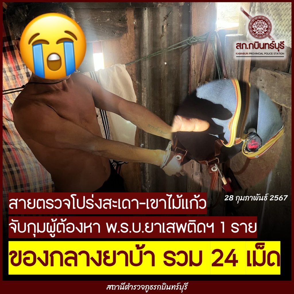 วันที่ 28 ก.พ.67 สายตรวจโปร่งสะเดา-เขาไม้แก้ว ได้ร่วมจับกุมตัว นายสำรวย อายุ 50 ปี พร้อมของกลาง ยาบ้า จำนวน 24 เม็ด กระทำความผิดฐาน “มียาเสพติดให้โทษประเภทที่ 1 (ยาบ้า) ไว้ในครอบครองเพื่อเสพโดยไม่ได้รับอนุญาตและเสพยาเสพติดให้โทษประเภทที่ 1 (ยาบ้า) โดยไม่ได้รับอนุญาต“ สถานที่จับกุม บ้านสันดัน ม.5 ต.เขาไม้แก้ว อ.กบินทร์บุรี จ.ปราจีนบุรี