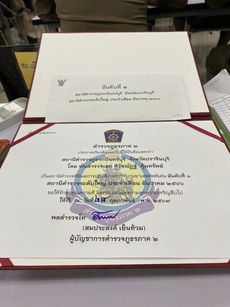 วันที่ 28 ก.พ.67 เวลา 15.00 น. พ.ต.อ.ศิวัชณัฏฐ์ คุ้มทรัพย์ ผกก.สภ.กบินทร์บุรี รับมอบใบประกาศเกียรติคุณ ชมเชยการปฏิบัติหน้าที่ราชการด้านป้องกันปราบปรามยาเสพติด ห้วงเดือนธันวาคม 2566 อันดับที่ 1 สถานีตำรวจระดับใหญ่ จาก พล.ต.ท.สมประสงค์ เย็นท้วม ผบช.ภ.2 ณ ห้องประชุมรอดบางยาง ภ.2