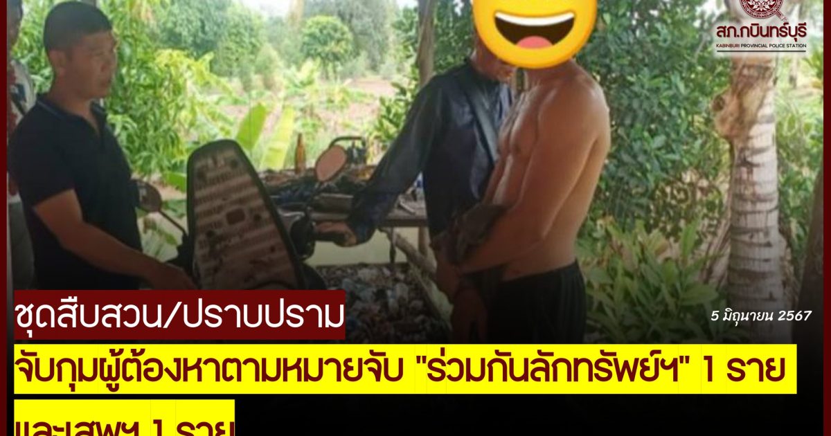 1. นายกานต์ อายุ 31 ปี ตามหมายจับศาลจังหวัดกบินทร์บุรี ที่ จ.32/2567 ลงวันที่ 1 พ.ค.67 กระทำความผิดฐาน “1.ร่วมกันลักทรัพย์ที่ใช้หรือมีไว้เพื่อสาธารณประโยชน์ในเวลากลางคืน โดยใช้ยานพาหนะเพื่อสะดวกแกการกระผิดหรือการพาทรัพย์นั้นไป หรือเพื่อให้พ้นการจับกุม 2.มีอาวุธปืน(ปืนดินดำ)ไว้ในความครอบครองโดยไม่ได้รับอนุญาต”