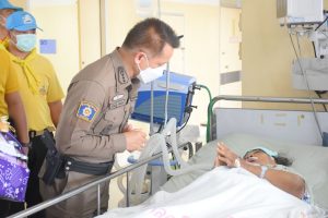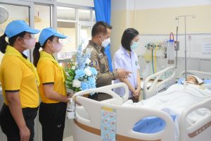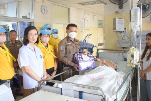 เป็นตัวแทน เข้าตรวจเยี่ยมให้กำลังใจพร้อมมอบกระเช้าให้กับผู้ได้รับบาดเจ็บจากอุบัติเหตุรถบัสคณะศึกษาดูงานเทศบาลตำบลพรเจริญ จ.บึงกาฬ พลิกคว่ำ ถนน 304 บริเวณศาลปู่โทน ที่เข้ารักษาตัวที่ โรงพยาบาลกบินทร์บุรี