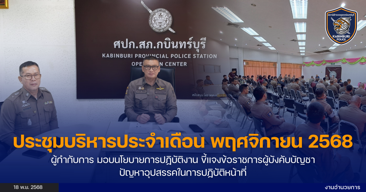 วันที่ 18 พ.ย.68 เวลา 10.00 น. พ.ต.อ.ธนาวุฒิ เปียผ่อง ผกก.(สอบสวน) รรท.ผกก.สภ.กบินทร์บุรี พ.ต.ท.เริงกฤตยชญ์ รักชาติ รอง ผกก.(สอบสวน) สภ.กบินทร์บุรี ,พ.ต.ท.สมชาย ปัดภัย รอง ผกก.ป.สภ.กบินทร์บุรี, พ.ต.ท.ชัชวาลย์ ดวงบุตร รอง ผกก.สส.สภ.กบินทร์บุรี พร้อมข้าราชการตำรวจในสังกัด ประชุมบริหาร สภ.กบินทร์บุรี ประจำเดือน พ.ย.68 ณ ห้องประชุมใหญ่ สภ.กบินทร์บุรี ชั้น 4