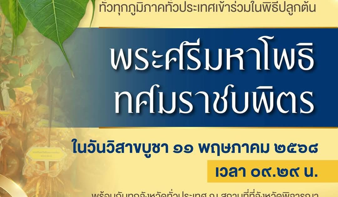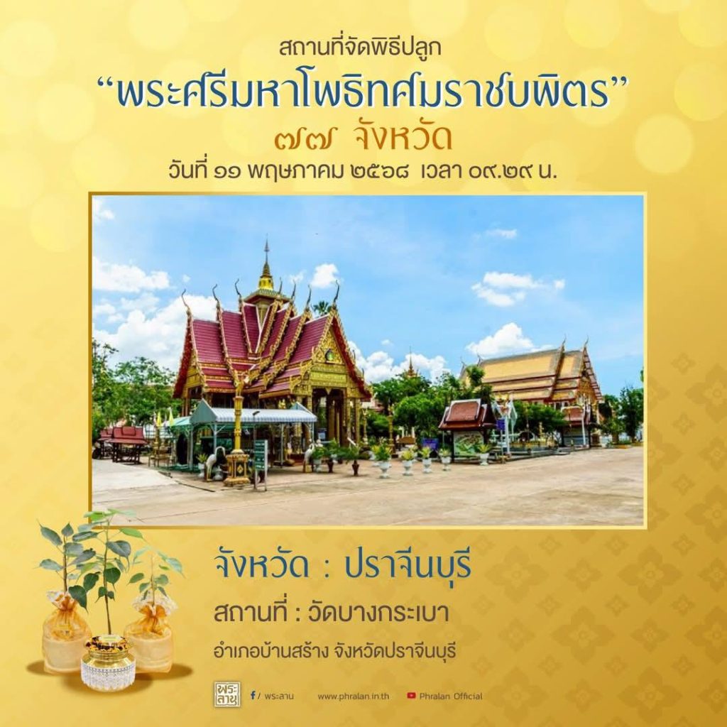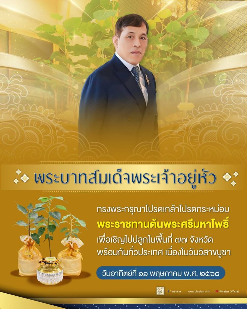 พระบาทสมเด็จพระเจ้าอยู่หัว ทรงพระกรุณาโปรดเกล้าโปรดกระหม่อมพระราชทานต้นพระศรีมหาโพธิ์ เพื่อเชิญไปปลูกในพื้นที่ 77 จังหวัด พร้อมกันทั่วประเทศ เนื่องในวันวิสาขบูชา วันอาทิตย์ที่ 11 พฤษภาคม พ.ศ. 2568 10 พฤษภาคม 2568 โดย kabinburi / ข่าวประชาสัมพันธ์,ข่าวกิจกรรม,ข่าวประชาสัมพันธ์,ข่าวประชาสัมพันธ์,ข่าวฝากประชาสัมพันธ์,งานอำนวยการ,สถาบันพระมหากษัตริย์ พระบาทสมเด็จพระเจ้าอยู่หัว ทรงพระกรุณาโปรดเกล้าโปรดกระหม่อมพระราชทานต้นพระศรีมหาโพธิ์ เพื่อเชิญไปปลูกในพื้นที่ 77 จังหวัด พร้อมกันทั่วประเทศ เนื่องในวันวิสาขบูชา วันอาทิตย์ที่ 11 พฤษภาคม พ.ศ. 2568 พระบาทสมเด็จพระเจ้าอยู่หัว ทรงพระกรุณาโปรดเกล้าโปรดกระหม่อมพระราชทานนาม พระศรีมหาโพธิ์ ที่จะทรงปลูกในวันวิสาขบูชา วันที่ 11 พฤษภาคม 2568 ณ พระที่นั่งอัมพรสถาน พระราชวังดุสิต พระราชทานนามว่า “พระศรีมหาโพธิยาลงกรณ์” (พระ – สี – มะ – หา – โพ – ทิ – ยา – ลง – กอน) มีความหมายว่า พระศรีมหาโพธิ์อันงดงามด้วยพระปัญญาตรัสรู้ ในการนี้ พระบาทสมเด็จพระเจ้าอยู่หัว ทรงพระกรุณาโปรดเกล้าโปรดกระหม่อมพระราชทานต้นพระศรีมหาโพธิ์ เพื่อเชิญไปปลูกในพื้นที่ 77 จังหวัด พร้อมกันทั่วประเทศและพระราชทานนามว่า “พระศรีมหาโพธิทศมราชบพิตร” (พระ – สี – มะ – หา – โพ – ทิ – ทด – สะ – มะ – ราด – ชะ – บอ – พิด) มีความหมายว่า “พระศรีมหาโพธิ์พระราชทานจากพระบาทสมเด็จพระเจ้าอยู่หัว ทั้งนี้ ทรงพระกรุณาโปรดเกล้าโปรดกระหม่อมพระราชทานฤกษ์การปลูก “พระศรีมหาโพธิทศมราชบพิตร” ในวันวิสาขบูชา ซึ่งตรงกับวันอาทิตย์ ที่ 11 พฤษภาคม 2568 เวลา 09.29 น. พร้อมกันทุกจังหวัดทั่วประเทศ ณ สถานที่ที่จังหวัดพิจารณาตามความเหมาะสม จังหวัดปราจีนบุรี ขอเชิญชวนประชาชนร่วมกิจกรรม ณ วัดบางกระเบา อ.บ้านสร้าง จ.ปราจีนบุรี เวลา 09.29 น.