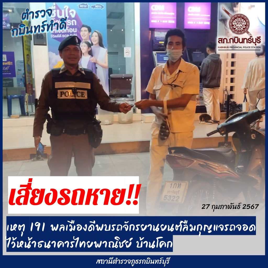 วันที่ 27 ก.พ.67 เวลา 21.00 น. ร.ต.อ.ทนงศักดิ์ ทรงประโคน รอง สวป.สภ.กบินทร์บุรี ,ด.ต.ปราโมทย์ ชมภูนุช ผบ.หมู่(ป.)สภ.กบินทร์บุรี สายตรวจเทศบาลเมืองหนองกี่ ออกเหตุ 191 พลเมืองดีพบรถจักรยานยนต์ลืมกุญแจรถจอดไว้หน้าธนาคารไทยพาณิชย์ บ้านโคก เจ้าหน้าที่จึงไปตรวจสอบ ต่อมาเจ้าของมาแสดงตัว ได้แนะนำให้ใช้ความระมัดระวังอย่าลืมกุญแจอีก และได้มอบกุญแจรถคืน