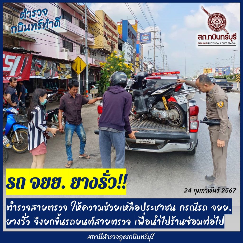 วันที่ 24 ก.พ.67 เวลา 10.00 น. ร.ต.อ.สมฤกษ์ ชาวน้ำอ้อม รอง สว.(ป.) สภ.กบินทร์บุรี พร้อมกำลัง ด.ต.เกียรติศักดิ์ สุทธิโยชน์ ผบ.หมู่(ป.)สภ.กบินทร์บุรี ,ส.ต.ต.ชินวัตร อุดม ผบ.หมู่(ป.)สภ.กบินทร์บุรี และ ส.ต.ต.จุฑาธร ถนอมพงษ์ ผบ.หมู่ (ผช.พงส.)สภ.กบินทร์บุรี ขณะออกตรวจในพื้นที่ ได้พบเห็นประชาชนจอดรถไว้ข้างทาง เจ้าหน้าที่ได้เข้าไปสอบถาม ทราบว่ารถยางรั่ว จึงได้ยกรถจักรยานยนต์คันดังกล่าวขึ้นท้ายกระบะรถยนต์สายตรวจ เพื่อนำไปร้านซ่อมรถต่อไป
