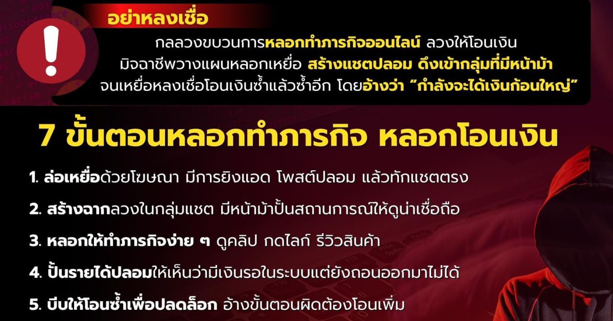 ขบวนการหลอกทำภารกิจออนไลน์ลวงให้โอนเงิน โดยมิจฉาชีพวางแผนหลอกเหยื่ออย่างเป็นระบบ ตั้งแต่สร้างแชตปลอม ดึงเข้ากลุ่มที่มีหน้าม้า จนเหยื่อหลงเชื่อโอนเงินซ้ำแล้วซ้ำอีก โดยอ้างว่า “กำลังจะได้เงินก้อนใหญ่”