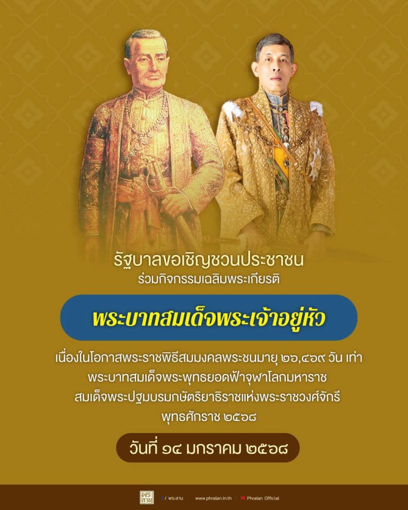 รัฐบาลขอเชิญชวนประชาชน ร่วมกิจกรรมเฉลิมพระเกียรติพระบาทสมเด็จพระเจ้าอยู่หัว เนื่องในโอกาสพระราชพิธีสมมงคลพระชนมายุ ๒๖,๔๖๙ วัน เท่าพระบาทสมเด็จพระพุทธยอดฟ้าจุฬาโลกมหาราช สมเด็จพระปฐมกษัตริยาธิราชแห่งพระราชวงศ์จักรี พุทธศักราช ๒๕๖๘
