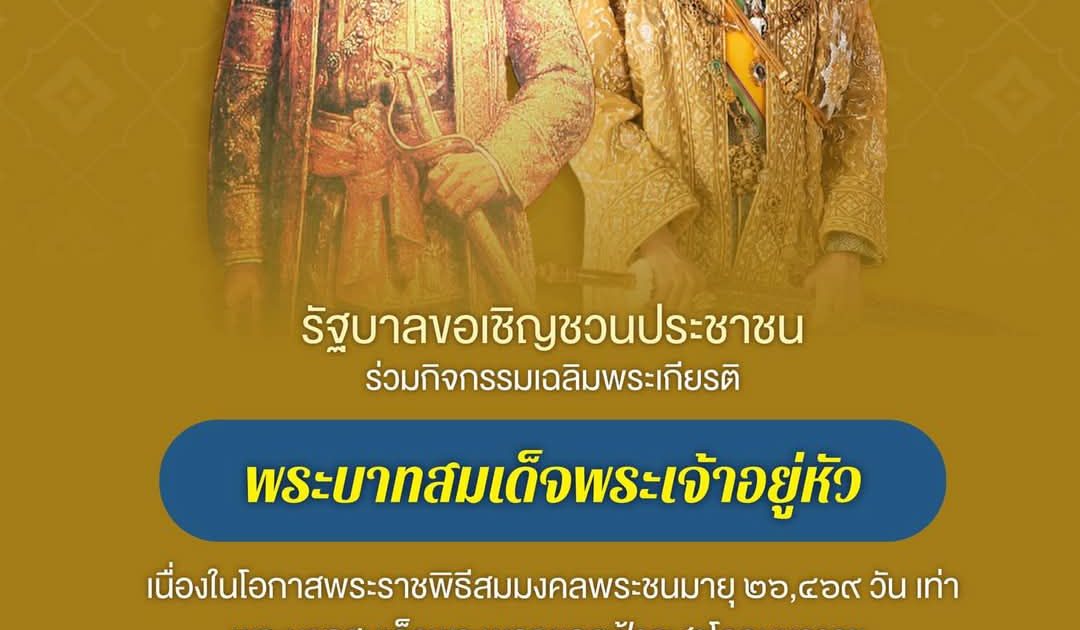 รัฐบาลขอเชิญชวนประชาชน ร่วมกิจกรรมเฉลิมพระเกียรติพระบาทสมเด็จพระเจ้าอยู่หัว เนื่องในโอกาสพระราชพิธีสมมงคลพระชนมายุ ๒๖,๔๖๙ วัน เท่าพระบาทสมเด็จพระพุทธยอดฟ้าจุฬาโลกมหาราช สมเด็จพระปฐมกษัตริยาธิราชแห่งพระราชวงศ์จักรี พุทธศักราช ๒๕๖๘