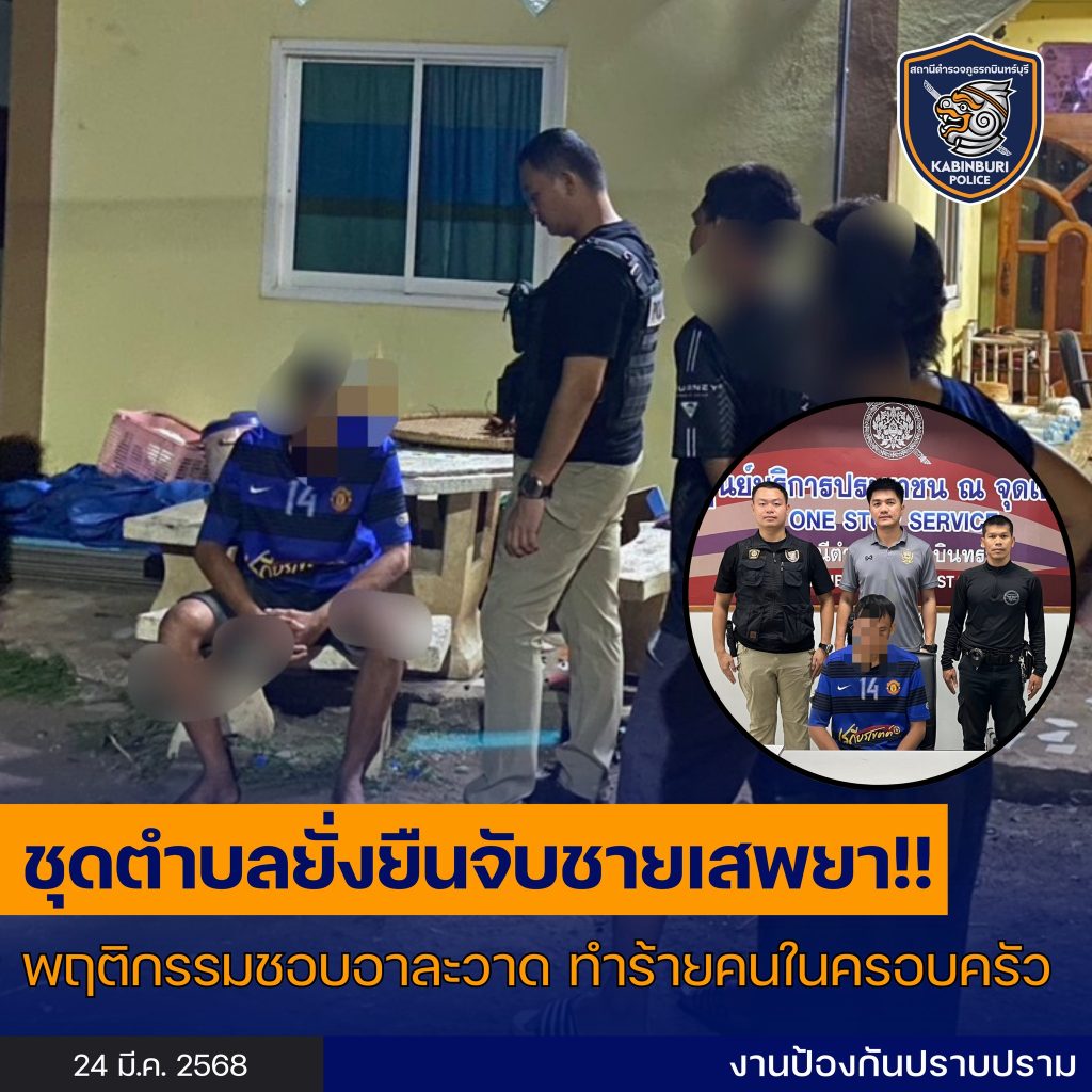 ร่วมจับกุมตัวผู้ต้องหา นายชุมพล หรือสาม อายุ 32 ปี ที่อยู่ ม.6 ต.เขาไม้แก้ว อ.กบินทร์บุรี จ.ปราจีนบุรี กระทำความผิดฐาน “เสพยาเสพติดให้โทษประเภท 1 (เมทแอมเฟตามีน) โดยไม่ได้รับอนุญาต” พฤติการณ์ในการจับกุม ผู้ต้องหาเสพยาแล้วมีพฤติกรรมชอบอาละวาดและทำร้ายคนในครอบครัว
