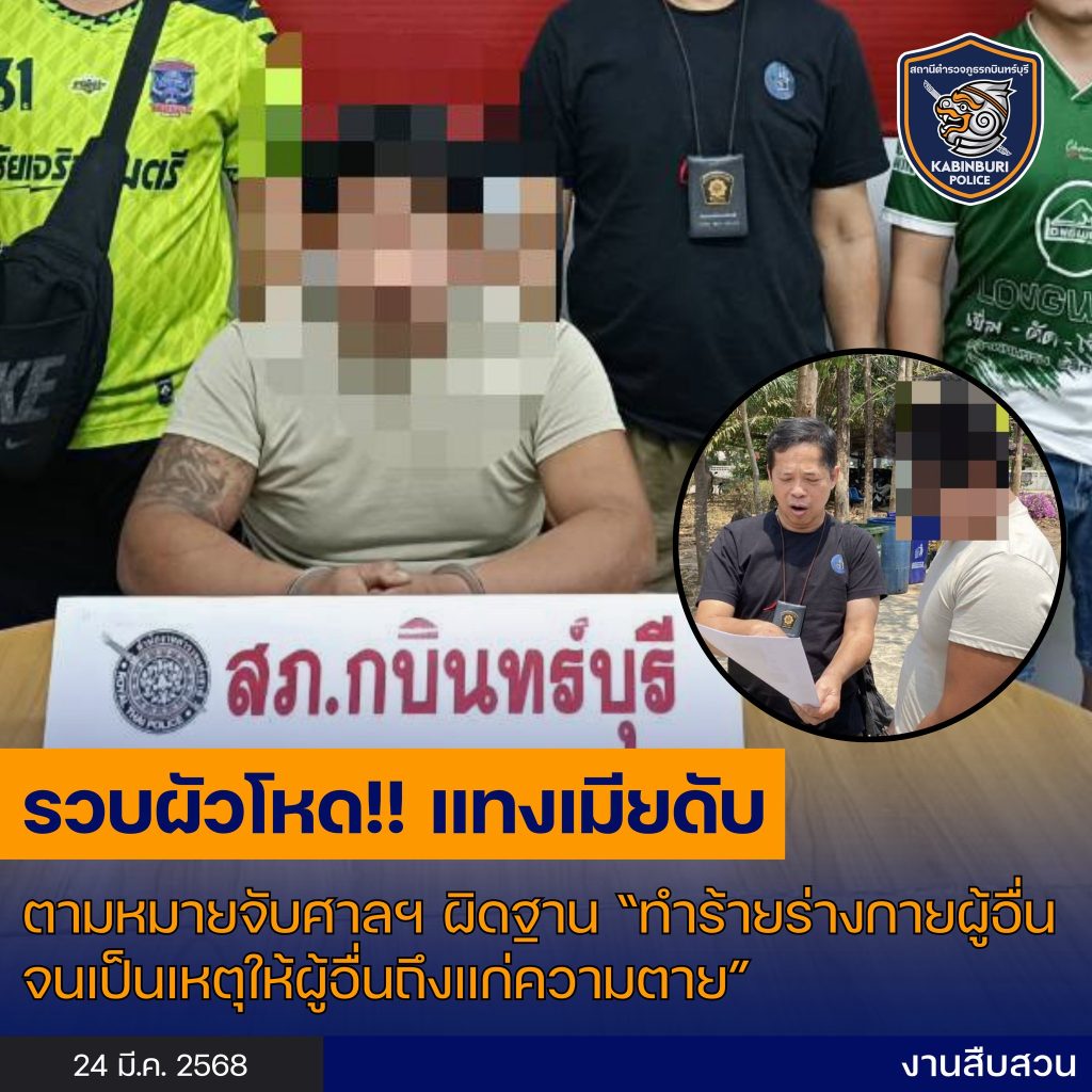 ร่วมจับกุมตัวผู้ต้องหา นายสุรพงษ์ หรือจ๋า อายุ 27 ปี ที่อยู่ ม.15 ต.วังดาล อ.กบินทร์บุรี จ.ปราจีนบุรี ตามหมายจับศาลกบินทร์บุรี จ.42/2568 ลงวันที่ 24 มีนาคม 2568 กระทำความผิดฐาน “ทำร้ายร่างกายผู้อื่น จนเป็นเหตุให้ผู้อื่นถึงแก่ความตาย” สาเหตุหึงหวง