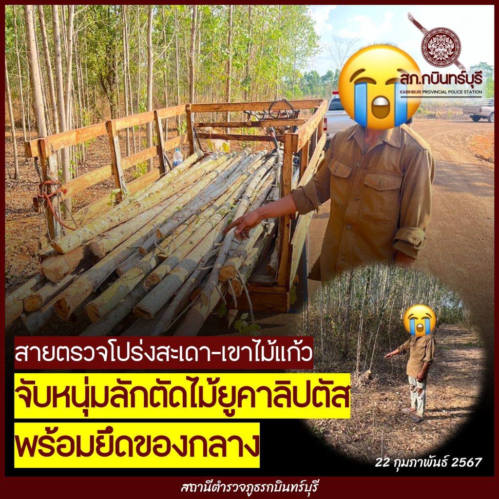 วันที่ 22 ก.พ.67 สายตรวจโปร่งสะเดา-เขาไม้แก้ว ร่วมจับกุม นายนฤชา อายุ 28 ปี สถานที่จับกุม บ้านโปร่งศรีสะเกษ ม.9 ต.เขาไม้แก้ว อ.กบินทร์บุรี จ.ปราจีนบุรี พร้อมของกลาง 1. รถไถ(อีแต๊ก) จำนวน 1 คัน 2. เครื่องตัดหญ้า จำนวน 1 เครื่อง 3. ไม้ยูคาลิปตัส จำนวน 16 ต้น (44ท่อน) 4. มีดขอ จำนวน 1 ด้าม กระทำความผิดฐาน “ลักทรัพย์ที่เป็นของผู้มีอาชีพกสิกรรม โดยใช้พาหนะเพื่อสะดวกแก่การกระทำความผิดหรือพาทรัพย์นั้นไปหรือให้พ้นการจับกุม“