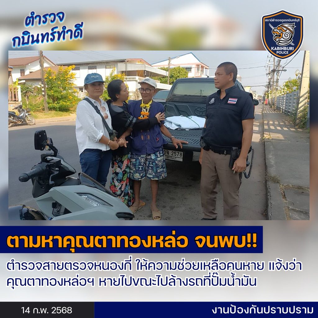 วันที่ 14 ก.พ.68 เวลาประมาณ 15.30 น. ด.ต.ปราโมทย์ ชมภูนุช ผบ.หมู่(ป.)สภ.กบินทร์บุรี พร้อมกำลังออกตามหาคุณตาทองหล่อ ก้องกังวาล อายุ 76 ปี ตามที่ญาติ แจ้งว่าได้เดินทางมากับคุณตาทองหล่อฯ เพื่อมาล้างรถที่ ปั๊มสตาร์เทค(เก่า) ต.เมืองเก่า อ.กบินทร์บุรี จ.ปราจีนบุรี ต่อมาผู้แจ้งพบว่าคุณตาทองหล่อฯ ได้หายตัวไป พร้อมทรัพย์สินติดตัวกว่า 30,000 บาท เมื่อได้รับแจ้ง เจ้าหน้าที่ได้ออกตามหาจนพบ ประสานญาติมารับตัวกลับบ้านต่อไป